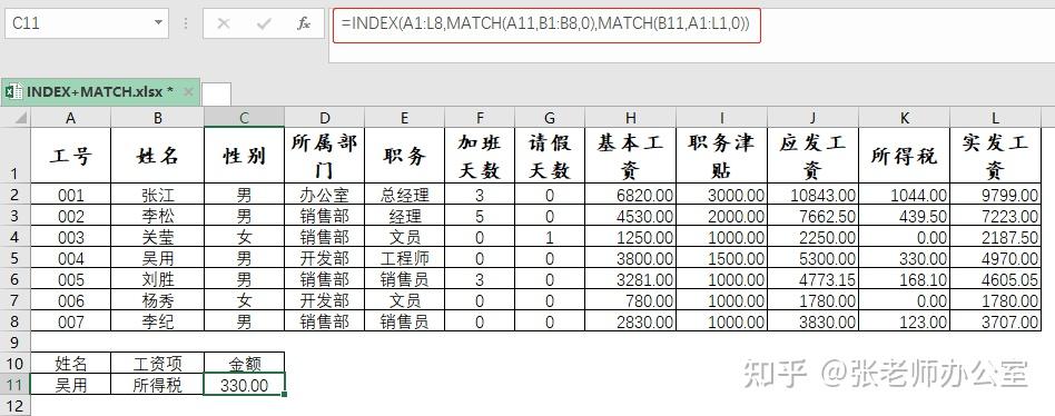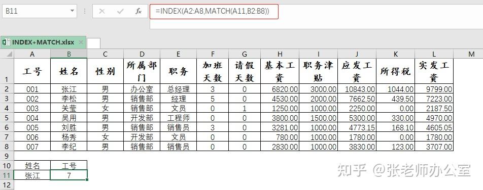 MATCH(A11,B1:B8,0) 查姓名(A11)在工资表(B1:B8)中的行的位置