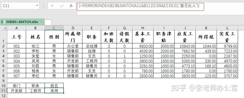 IFERROR(INDEX(B2:B8,MATCH(A11&B11,D2:D8&E2:E8,0)),"查无此人")