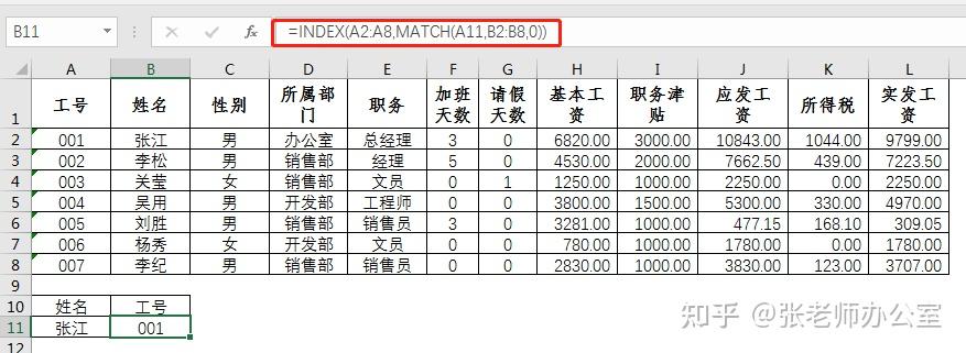 查找姓名(A11)在姓名列(B2:B8)的位置 INDEX(A2:A8,MATCH(A11,B2:B8,0)) 根据位置返回工号列(A2:A8)对应的工号