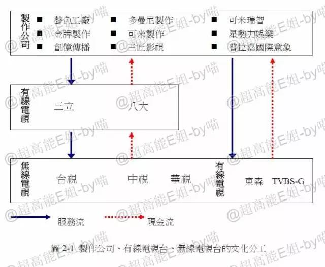 偶像剧这种创新类别是由新一批制作公司所生产的,无线电视、有线电视和制作公司三者共同合作,形成04有别于过去台湾戏剧产业的文化分工模式、整合00销模式,与商业经营模式接近。