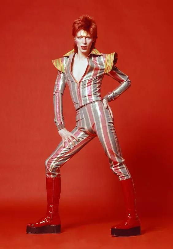 25 岁时,大卫·鲍伊的第二个人格 Ziggy Stardust 诞生了,他顶着一头火红的头发,额头上画着标志性的金色圆形图案,妆容浓烈,穿着色彩鲜艳的连体裤,是一位雌雄同体、能与外太空通信的摇滚明星。