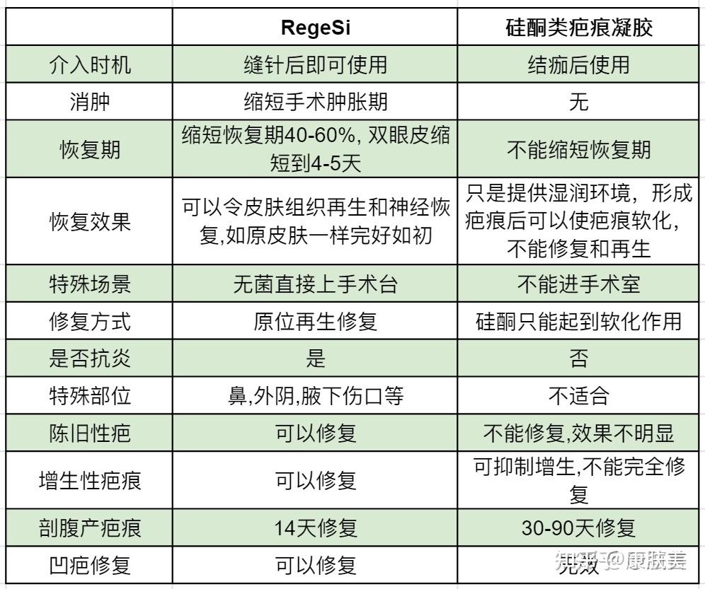 与硅酮类祛疤膏对比RegeSi存在着巨大的优势, 小编根据专业人士的访谈整理如下表格: