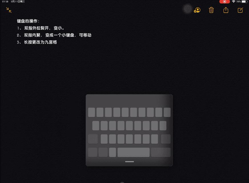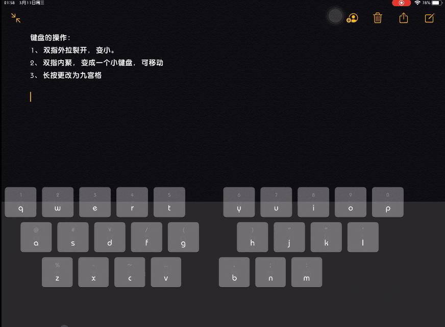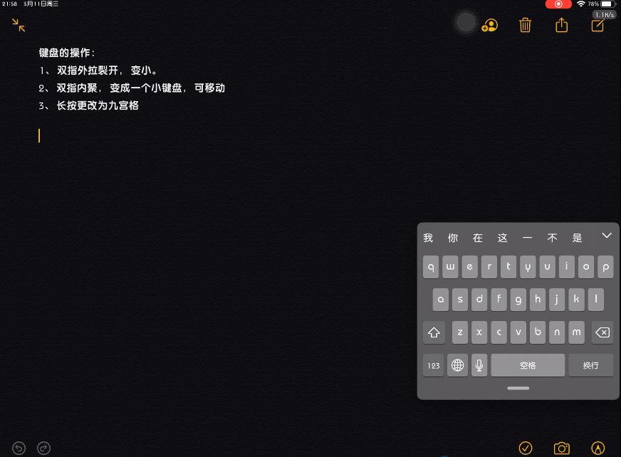 6.键盘技巧:双指内聚,键盘会变小,并且可以随意挪动,方便单手。