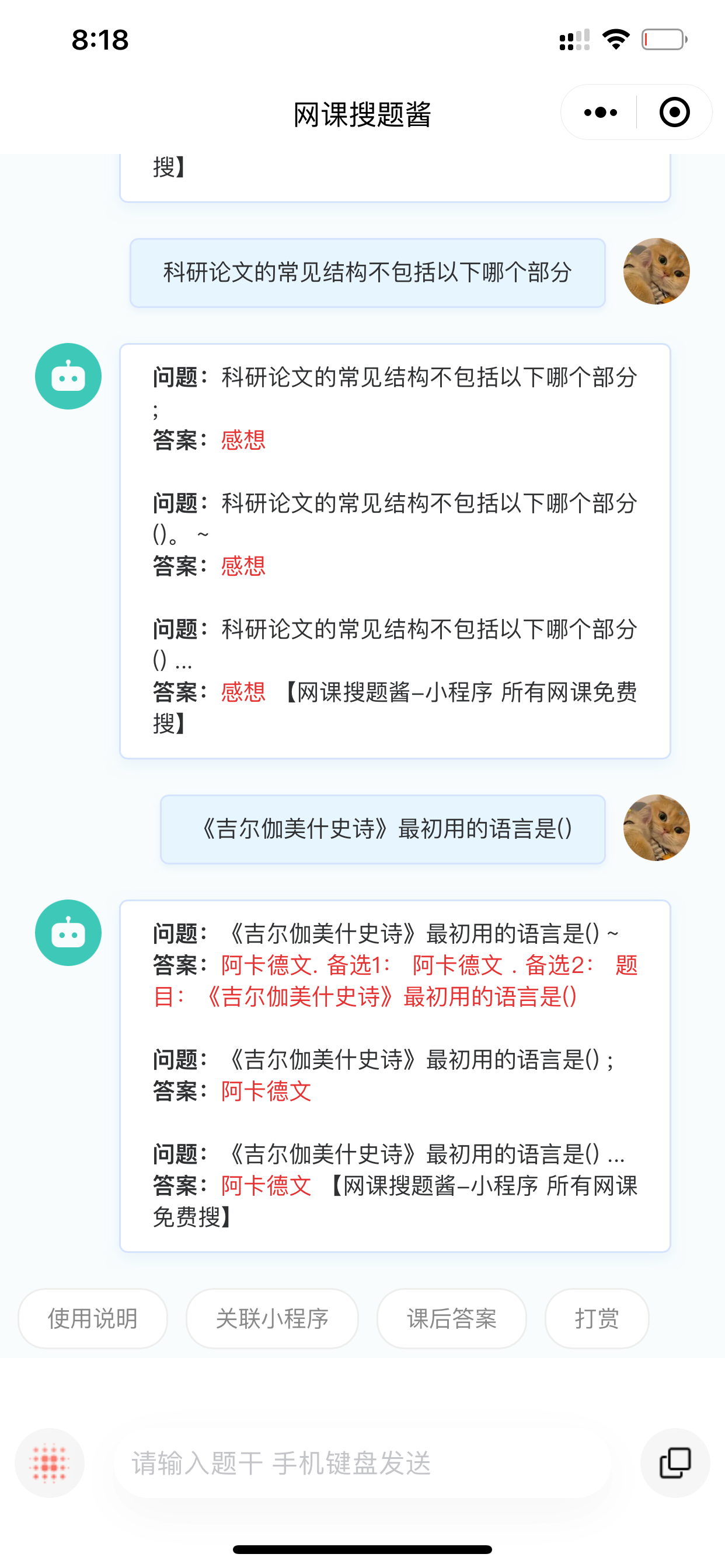 推荐原因:免费 这个公众号,是一款 聚合了好多款搜题软件的公众号 , 对话框可以直接搜题 ,题库好像挺多的,一次性能出好多答案,质量都挺高的。也是一次性出三个答案