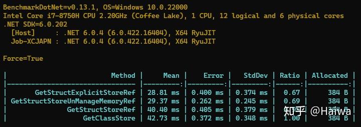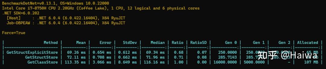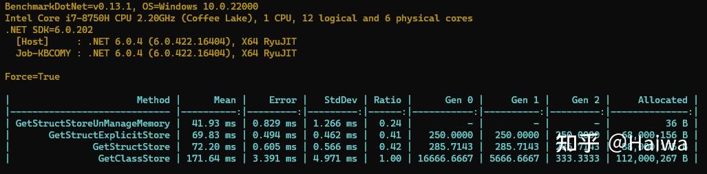 我们再来跑一下结果,我们的Explicit结构体遥遥领先,比使用类足足快 33%,而上一轮中使用非托管内存表现也很好,排在了第二的位置。