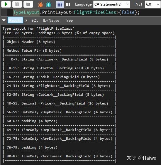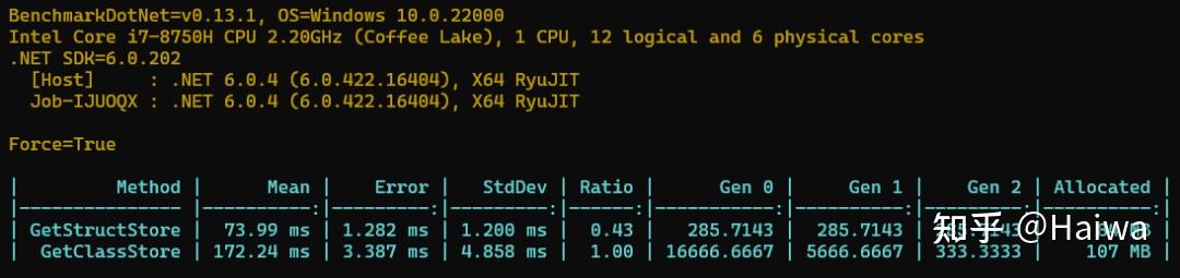 - 对象占位符 :大小为8Byte,当前的GC要求所有的对象至少有一个当前指针大小的字段,如果是一个空类,除了对象头和方法表指针以外,还会占用8Byte,如果不是空类,那就是存放第一个字段。也就是说一个 空类 不定义任何东西,也至少需要 24byte 的空间, 8byte对象头+8byte方法表指针+8byte对象占位符 。回到本文中,由于不是一个空类,所以每个对象除了数据存储外需要额外的 16byte 存储对象头和方法表,另外数组需要 8byte 存放指向对象的指针, 所以一个对象存储在数组中需要额外占用24byte的空间 。我们再来看看值类型(结构体)。