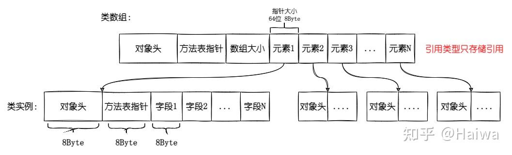 我们可以看到类数组只存放指向数组引用元素的指针,不直接存储数据,而且每个引用类型的实例都有以下这些东西。