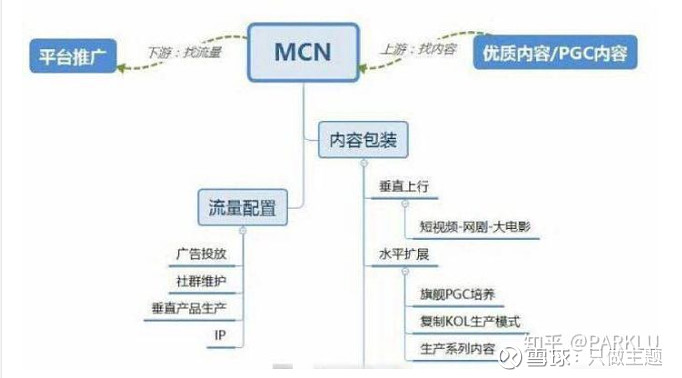 MCN:Multi-Channel Network,多频道网络业态,MCN模式源于国外成熟的网红经济运作,其本质是一个多频道网络的产品形态,将PGC内容联合起来,在资本的有力支持下,保障内容的持续输出,从而最终实现商业的稳定变现。上游对接优质内容,下游寻找推广平台变现。国外的MCN早期以经纪模式为主,帮助视频红人变现。而国内的MCN模式不同,机构只需要和内容生产者对接上,内容生产者专心做内容,MCN机构帮你包装、营销、推广和变现。(引用自知乎:PARKLU)