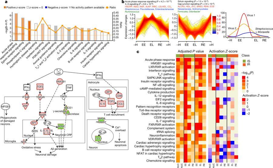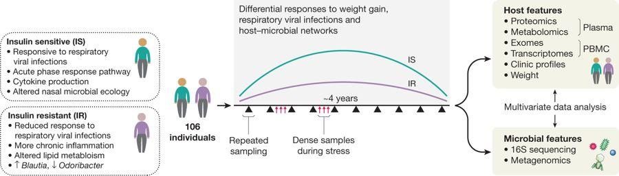 值得注意的是, 在呼吸道病毒感染和免疫过程中个体会表现出数千种特定的分子和微生物变化,但免疫引发的潜在保护性反应与呼吸道病毒感染不同,且胰岛素抵抗和胰岛素敏感的个体的分子和微生物模式也有明显不同 ,表明两组宿主与微生物群相互作用的模式不同。