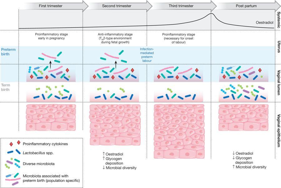 一般来说, 通常开始妊娠时阴道微生物群生态复杂性更高的妇女,在妊娠中期通常会发展成以乳酸菌为主的微生物群聚集,包括 L. crispatus、L. iners、L. gasseri 和 L. jensenii 。