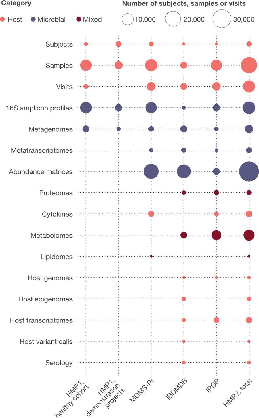 在为期10年的人类微生物组项目(HMP2)的第二阶段中,探讨了微生物群在怀孕与早产 (Multi-Omic Microbiome Study: Pregnancy Initiative, MOMS-PI) 、炎症性肠病 (The Inflammatory Bowel Disease Multi-omics Data, IBDMDB) 、Ⅱ型糖尿病 (Type 2 diabetes mellitus, T2D) 中的作用 ,提供了迄今为止对宿主和微生物群最全面的分析,开始从机制上解决宿主和微生物组之间的关系,揭示了它们之间之间复杂的相互作用,及其随着时间的推移而变化的重要洞见,并为未来的工作提供实验方案,数据以及生物样本。