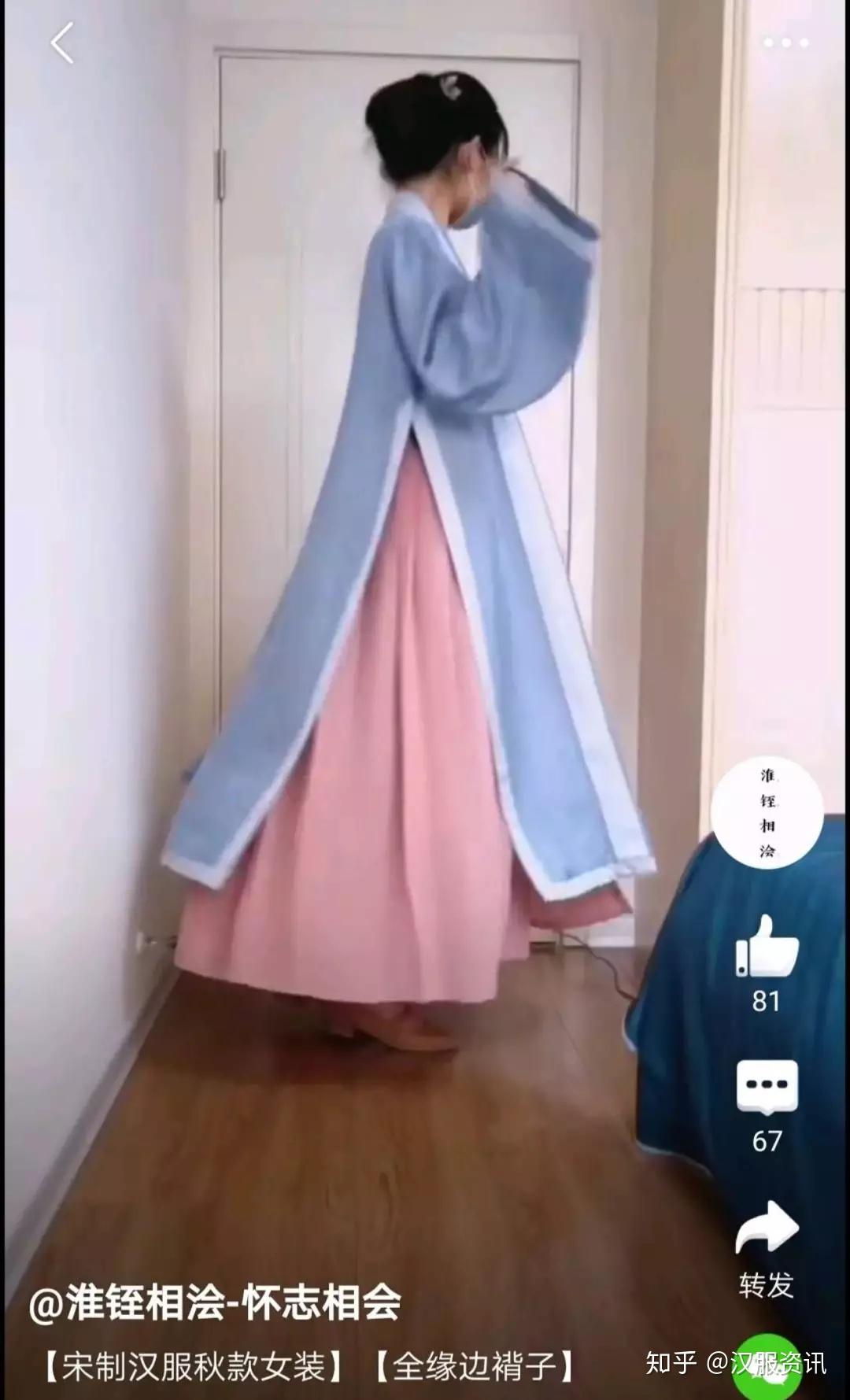 我的很喜欢踏云馆出的每一款宋制!这款面料是雪纺绒缎,比普通雪纺厚,表面像毛绒一样,有珠光感,领缘还钉了一串珠。有蓝色和粉色两个颜色,蓝色绝美。