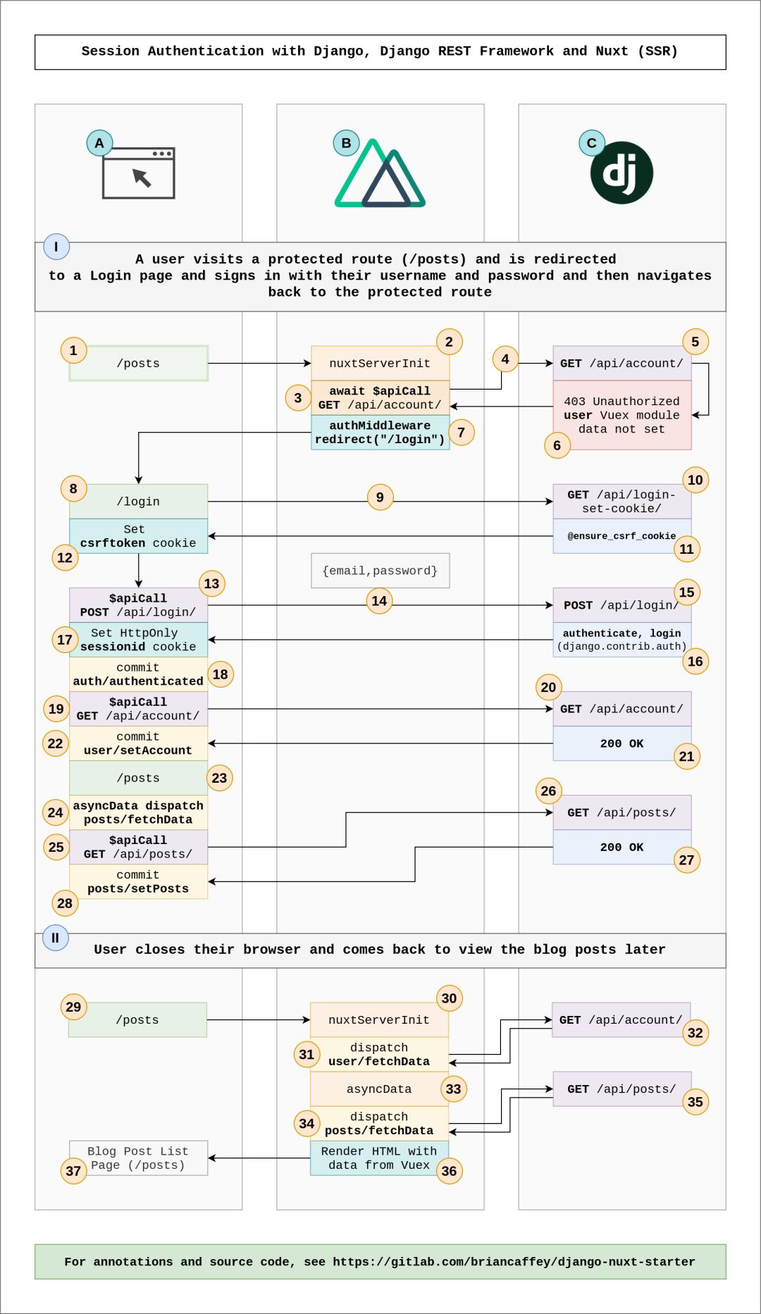 上图主要针对基于 session 的身份验证进行说明,重点是浏览器,Nuxt 服务器和 Django 服务器:用户使用新的浏览器访问该站点,导航到“登录”页面,使用凭据登录,然后访问一个受保护的页面: