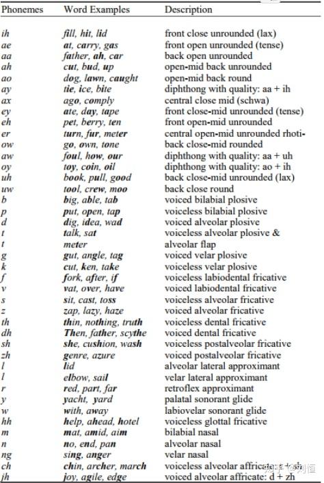 语音的原子单位称为音素。 单词按顺序包含一个或多个音素。 音素的声学实现称为电话。 下表是美国英语的音素表和常见实现。