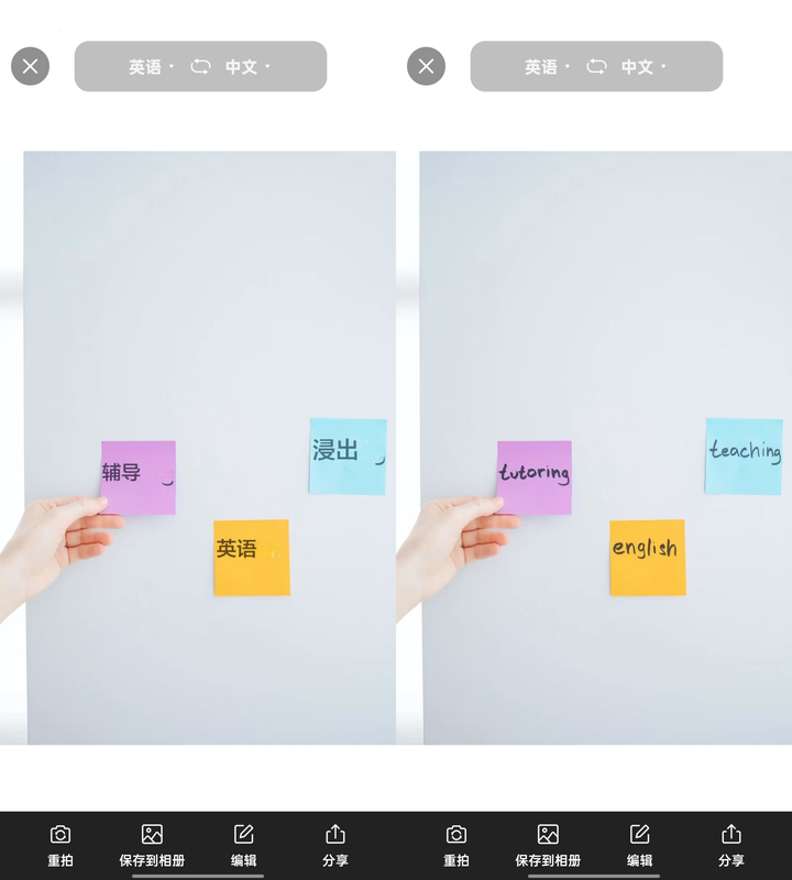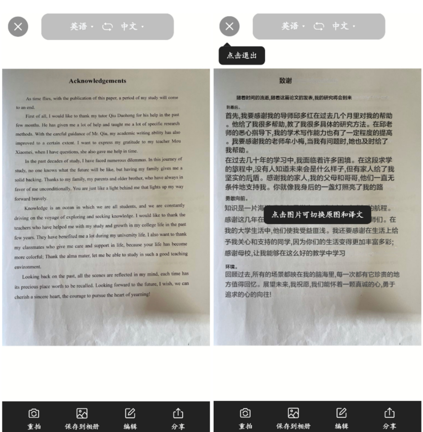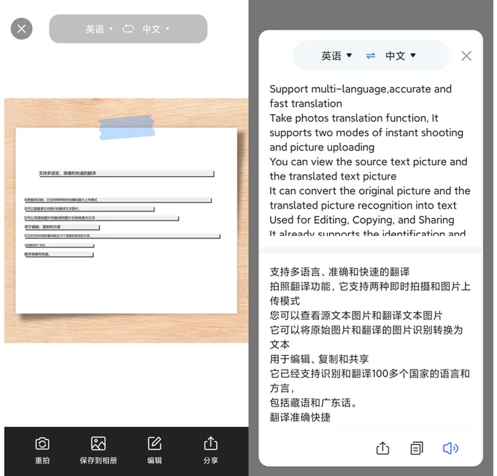 上传图片之后会自动翻译结果,点击可以查看翻译前后的图片内容,支持编辑、分享、重拍或者是保存翻译后的图片内容。