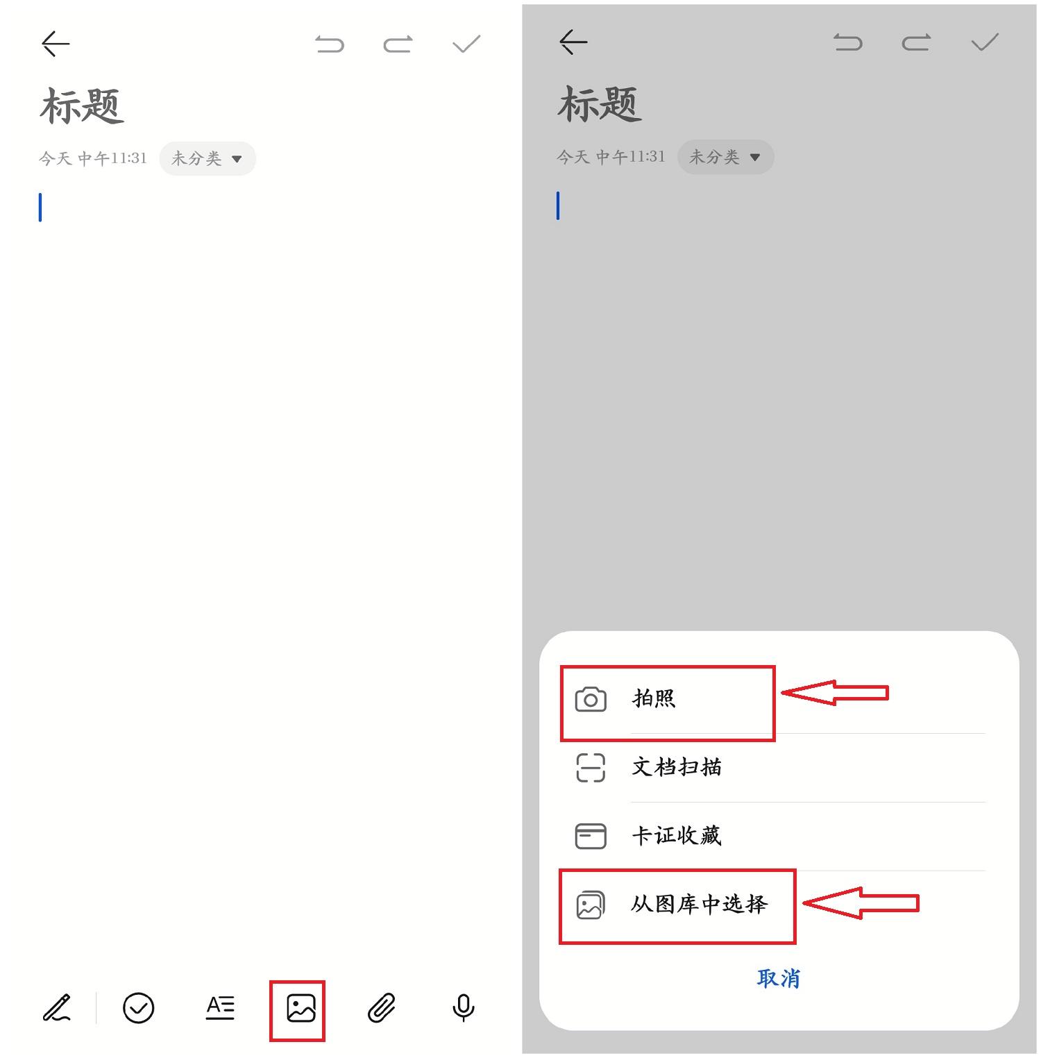 打开备忘录点击【+】新建一个备忘录,点击下方【图片】可以拍照或是从相册导入图片。