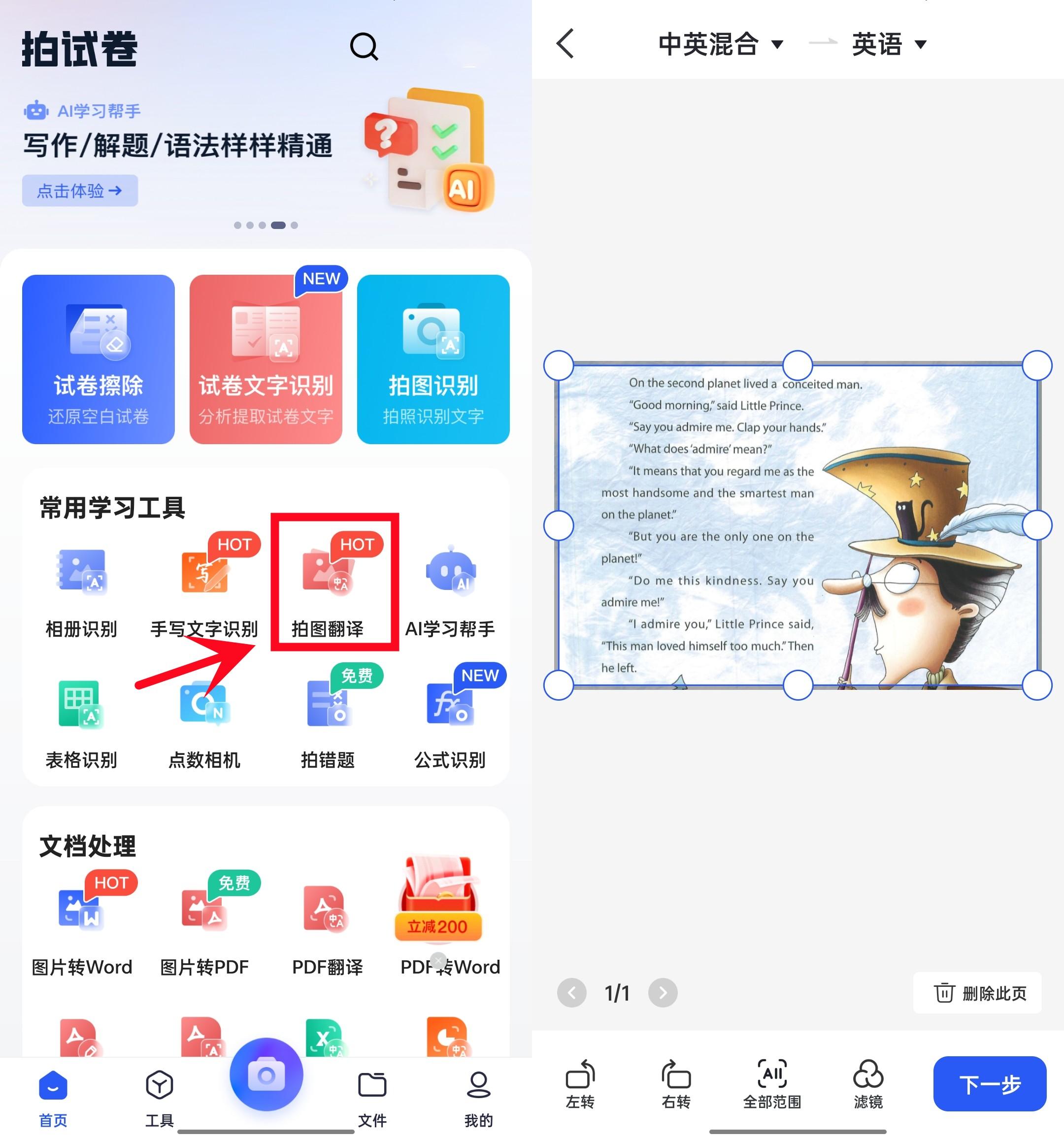 一款多功能的宝藏学习办公神器, 内置【AI学习帮手 】 ,写作/解题/语法样样精通 ,同时,拍图翻译也是它非常热门的工具之一,试了你就知道有多赞!