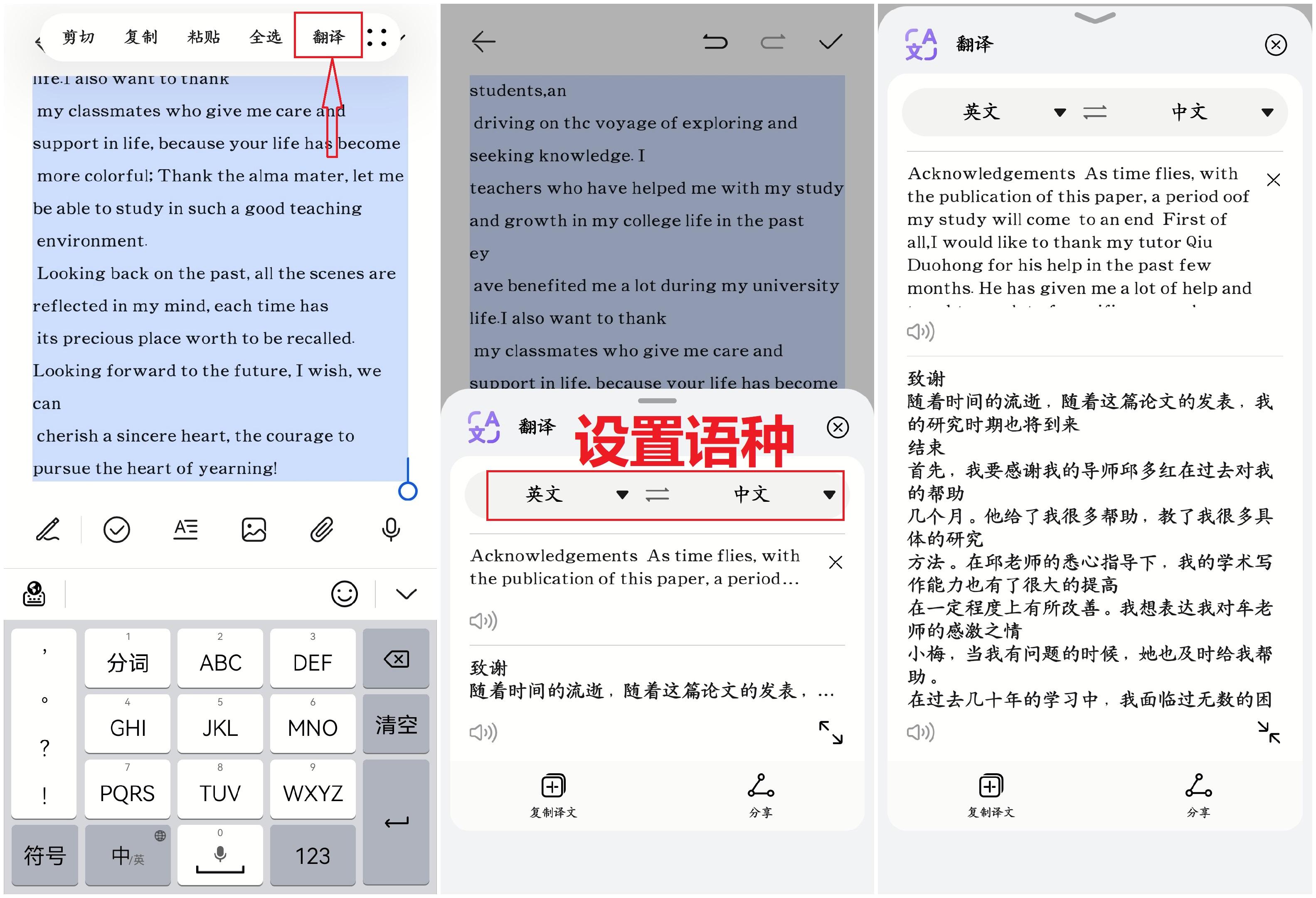 选中这些文字,点击【翻译】,选择输入语种以及输出语种,就可以看到结果了,支持复制与分享哦。