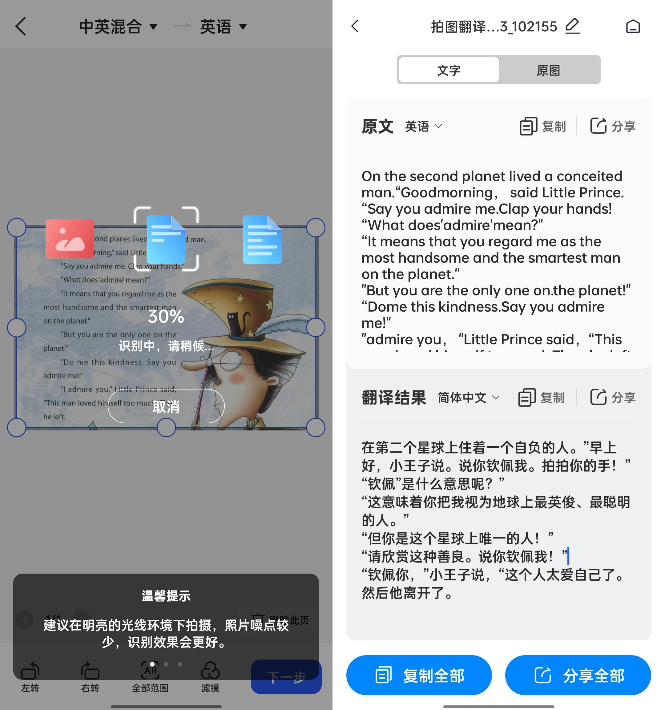 翻译结果支持与原图对照,确认无误的话就可以一键复制分享啦!总的来说,它的拍图翻译功能对我这个偶尔需要翻译的人来说真的超方便。