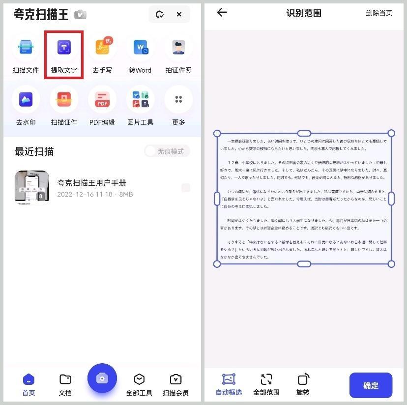 点击【扫描王】之后可以看到【提取文字】功能,点击之后我们可以直接对准需要翻译的内容拍照或是从相册导入已经拍好的图片进行识别。
