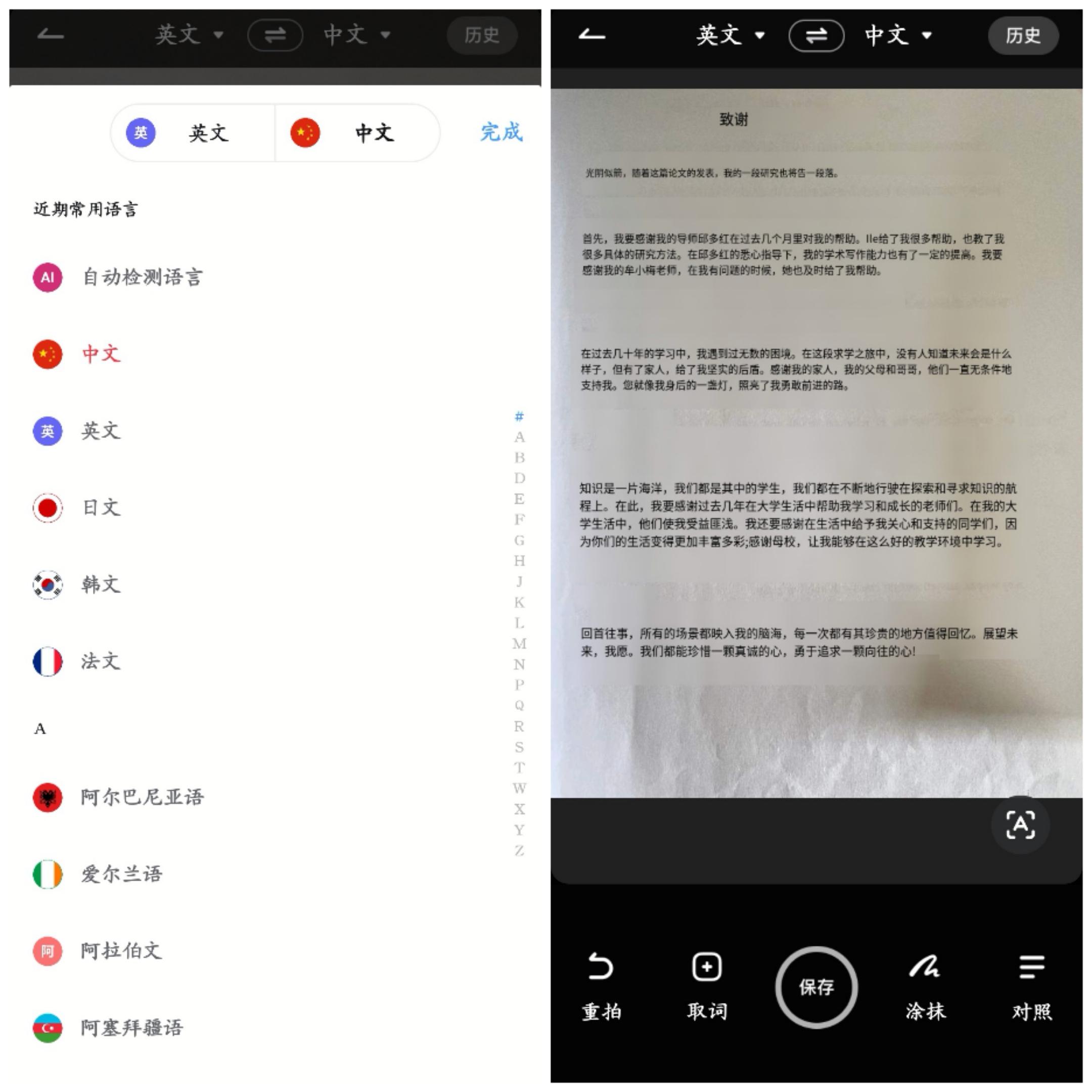 可以选择翻译前后的语种,直接拍照或是从图库选择已经拍好的图片翻译都是可以的。