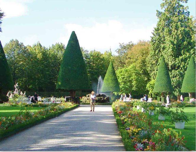南侧的宫廷礼拜堂,穹顶之上有着600平方米壁画,栩栩如生;椭圆与三角形等几何图形结合巧妙,再配上富丽堂皇的立柱,令人赞叹;东侧的宫廷花园,喷泉、瀑布、台阶、植物、林荫小道散布其中,大大小小的雕塑引人入胜;