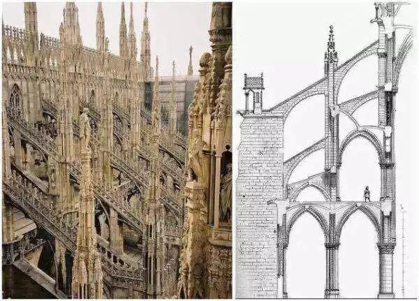 为了让建筑变高,罗马式那些沉重的大圆顶自然不能要。 塔顶越变越尖, 像利剑直插云霄,并且为了让建筑够高, 飞扶壁 也因此被创造出来,用来支撑奇高的建筑。