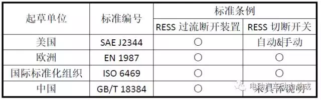 对于储能系统的切断的标准上,美国SAE J2344、欧标EN 1987、ISO 6469、国标GB/T 18384电动汽车安全要求条例具有相应的切断装置的要求,如表1: