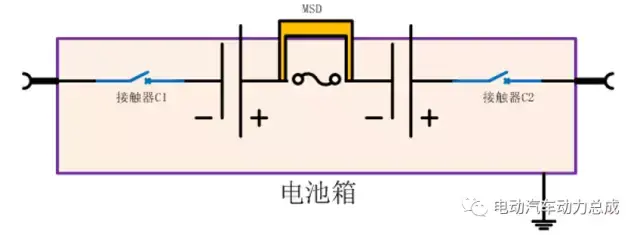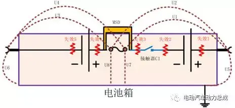 注:接触器放置于电池中间,MSD在电池一极,此时当接触器粘连失效时,MSD的一极与电池一极存在的电压为UBattery。
