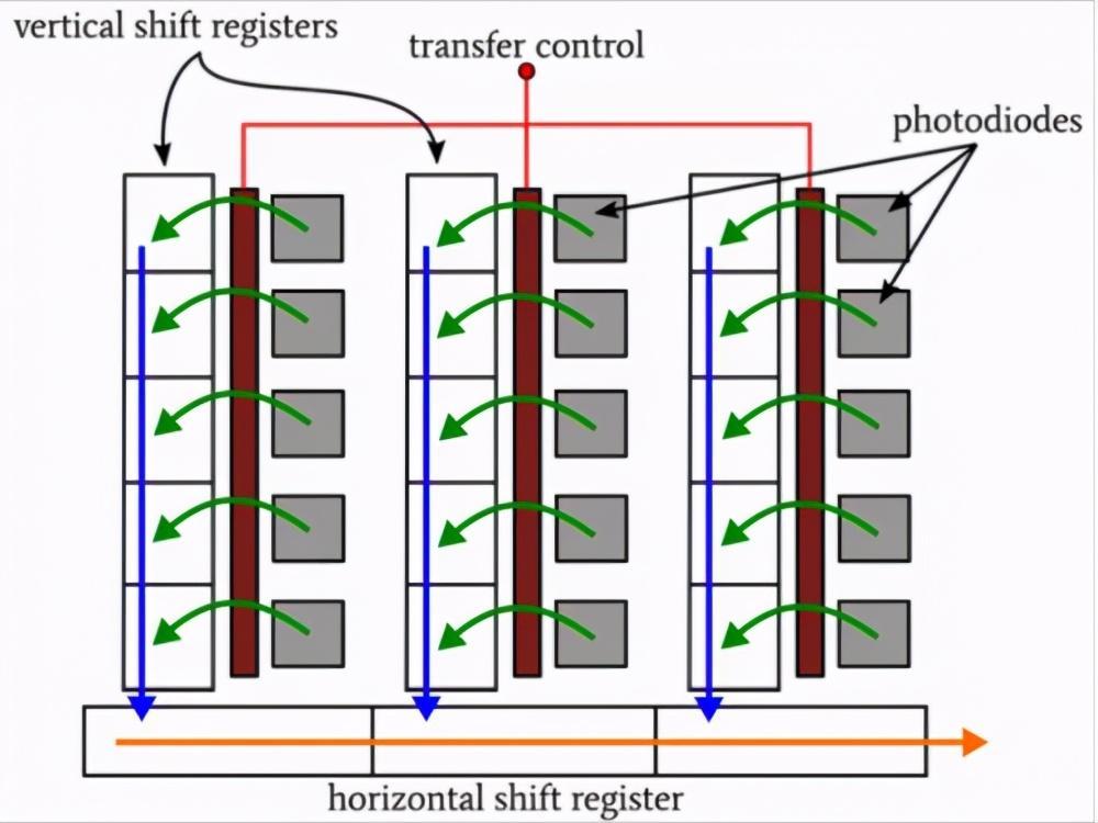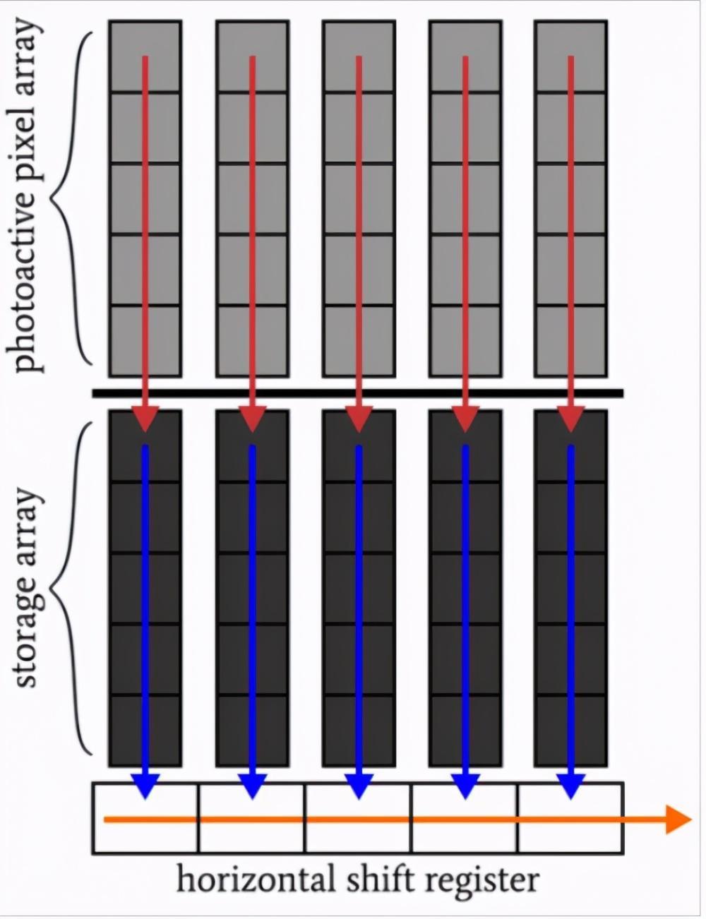在集成之后,用于所有像素的电荷包被快速地传输到存储阵列,然后在存储阵列中发生读出。当读取存储位置时,活动像素可以为下一图像累积电荷,这使得帧传输CCD能够获得比全帧CCD更高的帧速率。