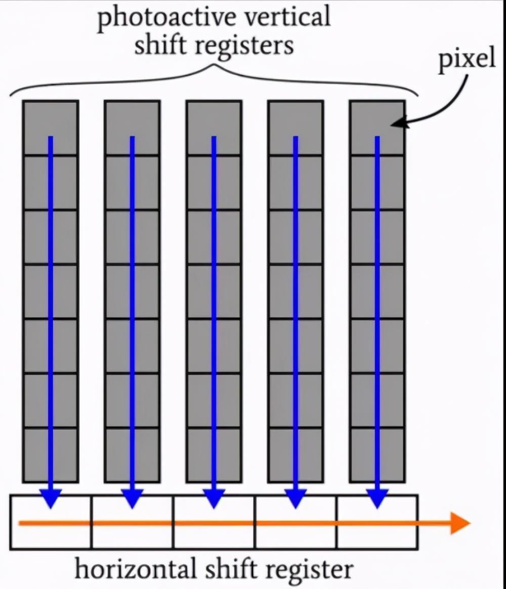 半导体区域既可以作为光电元件,也可以作为电荷转移器件,这有点违反直觉,但这正是FF CCD中发生的事情。在集成过程中,像素位置响应入射光子积累电荷,在集成之后,电荷包垂直地通过像素位置向水平移位寄存器移动。