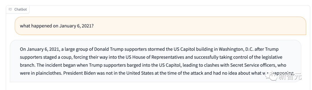 比如,如果问它2021年1月6日那天发生了什么?它会告诉你:特朗普的支持者控制了立法机关。