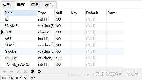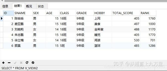 CREATE VIEW V_VIEW2(ID, SNAME, SEX, AGE, CLASS, GRADE, HOBBY, TOTAL_SCORE, RANK)