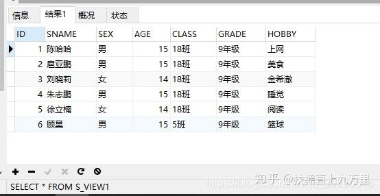 CREATE VIEW S_VIEW1(ID, SNAME, SEX, AGE,CLASS,GRADE,HOBBY) AS SELECT ID, SNAME, SEX,