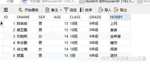 INSERT INTO `student` (`ID`, `SNAME`, `SEX`, `AGE`, `CLASS`, `GRADE`, `HOBBY`) VALUES ('1', '陈哈哈', '男', '15', '18班', '9年级', '上网');