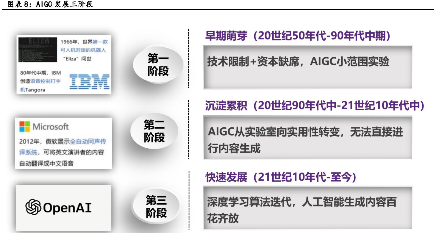伴随人工智能发展演进,AIGC发展可分为三阶段,早期萌芽阶段(20世纪50年代至90年代中期)、沉淀累积阶段(20世纪90年代至21世纪10年代中期)、快速发展阶段(21世纪10年代中期至今)。