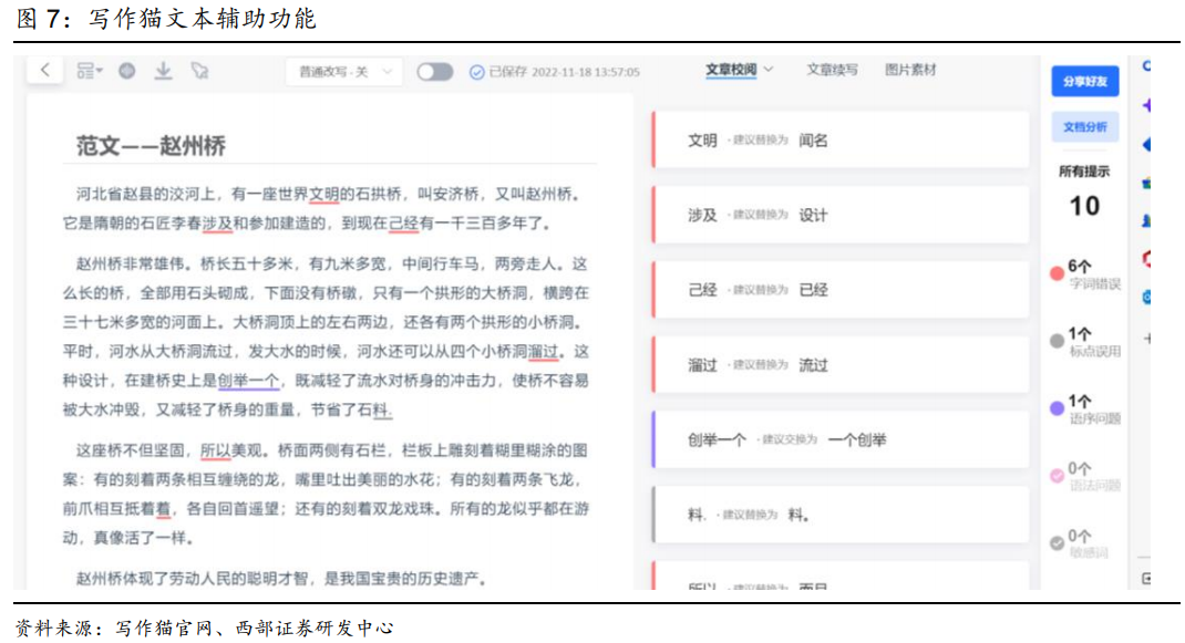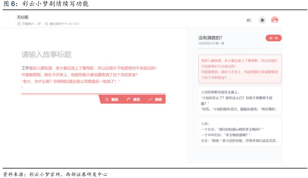 公司已推出AI主播、AI绘画和AI文字创作功能,并在研发推动更多AIGC功能落地。其中AI主播已在有声书生产中应用,根据文字故事情节的真实语境,用独创的情绪情感控制模块,结合语音深度学习合成技术,真实还原角色情感,生动模拟人声音色以塑造角色,讲述故事。AI文字创作功能已在17K小说网上线,可自动生成文字内容,作者在使用该功能时,通过针对不同的描写场景填写关键词和辅助短语,即可生成对应的文字内容描写用于作品使用,目前可针对人物、物品等进行AI文字创作,并针对不同的作品类别古风、都市等进行不同的内容适配。未来,随着技术的迭代更新,Al可在更多应用领域提升内容创作效率,产出更多精品内容,降低成本,扩大更多AI内容衍生品类。公司背后AIGC的技术提供方是澜舟科技。