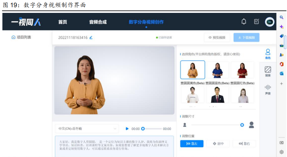 目前“深度合成+计算驱动”型的虚拟人,综合运用文本、图像、音频等生成技术,打造综合外观、面部表情、发声习惯等产出全面拟人化的数字内容,属于AIGC领域。此种多模态生成技术的聚合应用在虚拟偶像、虚拟主播等领域已有广泛应用。