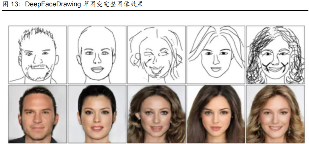 此处则主要指基于草图生成完整图像(VansPortrait、谷歌Chimerapainter可画出怪物、英伟达GauGAN可画出风景、基于草图生成人脸的DeepFaceDrawing)、有机组合多张图像生成新图像(Artbreeder)、根据指定属性生成目标图像(如Rosebud.ai支持生成虚拟的模特面部)等。