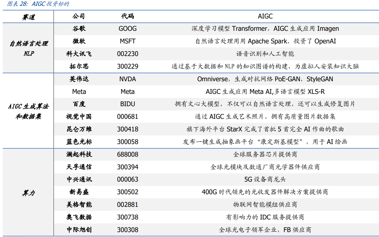 从业务层面看,结合国内外发展情况,目前在AIGC的知识产权归属方面尚有法律空缺,且创作伦理问题也未得到有效解决,因此无论是技术还是商业层面,高质、干净的数据集对于模型训练及内容生成均有至关重要的影响。同时,随着AIGC逐步落地,其算力需求将大增,未来相关企业除用云计算之外,或组建自有算力集群,考虑到英伟达A100、H100出口受限,相关国产算力芯片将有机会获得增量市场。