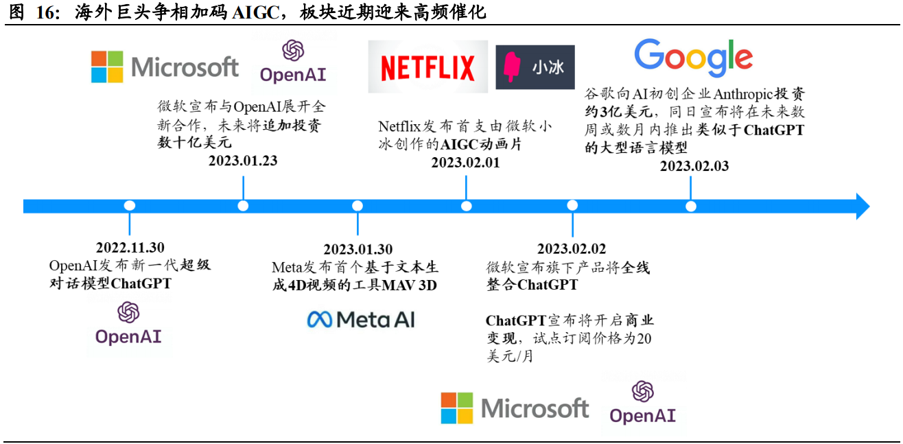 1月23日, 微软 宣布与OpenAI展开全新合作,未来将追加投资数十亿美元,2月2日,微软宣布旗下产品将全线整合ChatGPT,对于微软而言,ChatGPT在拟人化交流、即时生成内容等方面对必应(Bing)的赋能有望助其突破谷歌的桎梏,作为回应,谷歌即刻投资Anthropic并计划推出类似于ChatGPT的大型语言模型。除了加码AI文本、代码生成以外,海外巨头如 Meta、Netflix 亦着力布局音视频等内容生成,未来人机协同或是大势所趋。