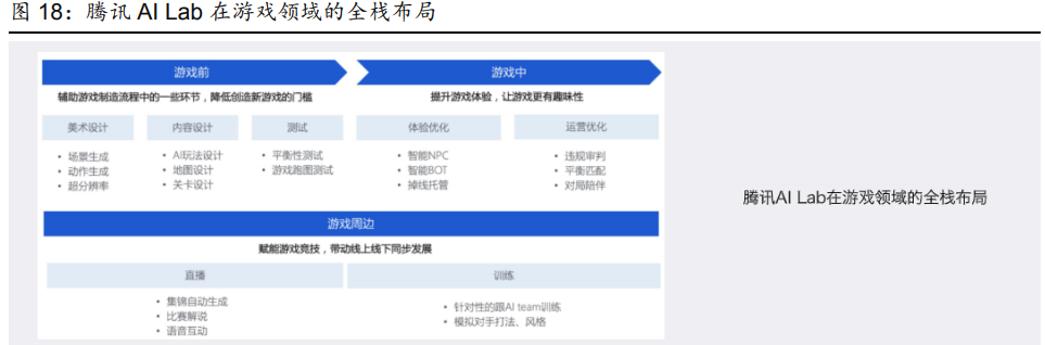 以腾讯AILab在游戏制作领域的布局为例,人工智能在游戏前期制作、游戏中运营的体验及运营优化、游戏周边内容制作的全流程中均有应用。