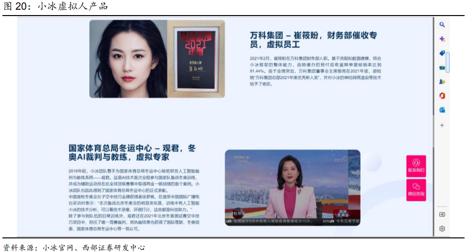 例:小冰虚拟人产品,基于小冰框架的全域底层能力,整合实现了虚拟人形象定制、内容生产、渲染呈现、交互响应等多个关键技术模块,以完备的产品架构支撑多样化的应用场景,如直播、教育、数字员工等,并以此赋能各行各业。