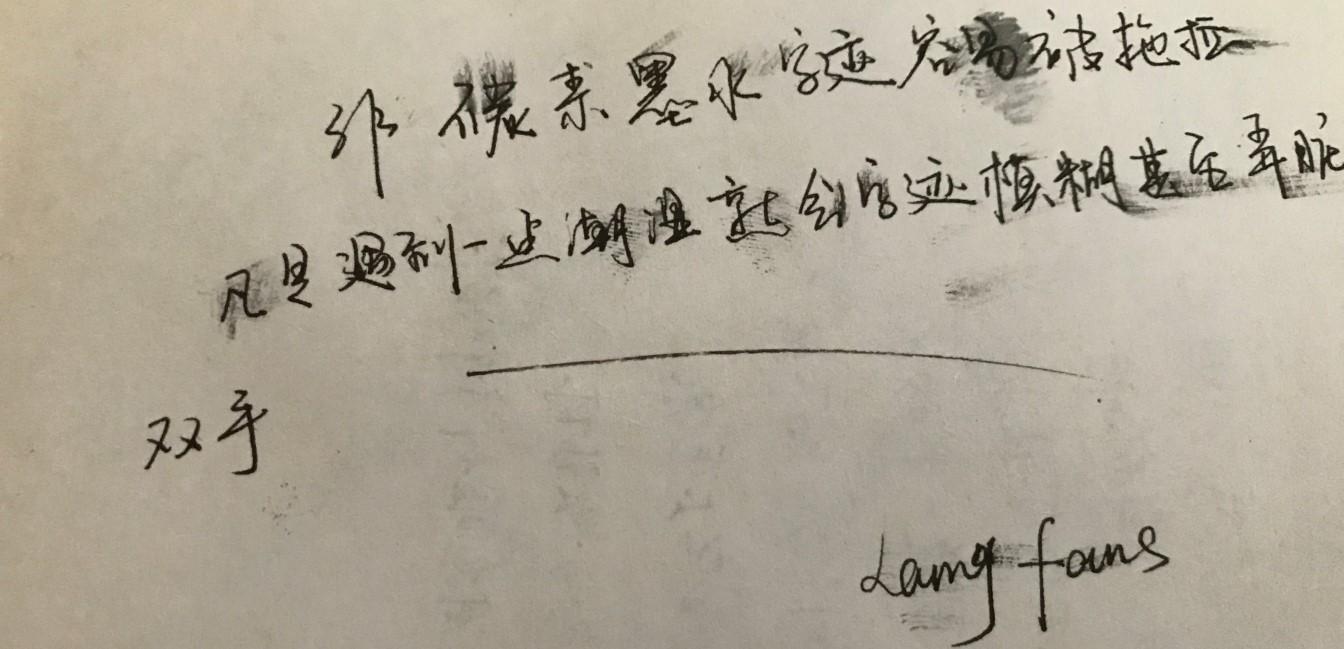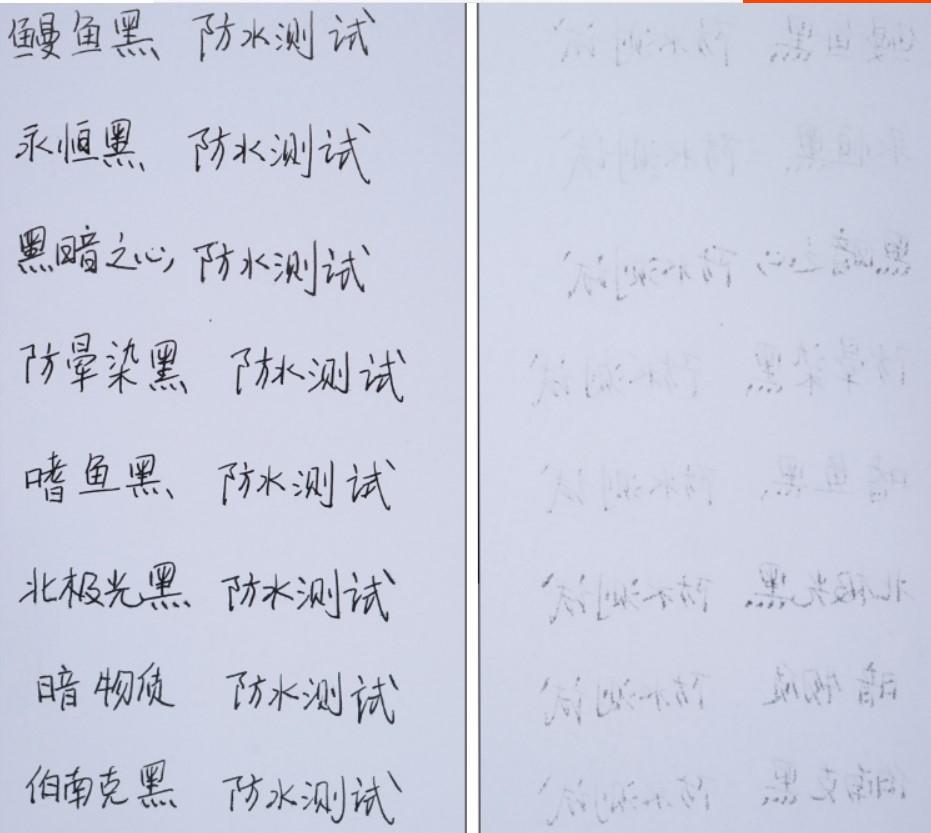 但是相对的,非碳素墨水就少了几分稳定性了。 它十分容易被稀释和分解。用过LAMY钢笔的朋友,基本都会有这样的体验:只要有一点点水触碰到LAMY钢笔的字迹,字迹就会被拖沓。如下图是我用原装黑墨水的演练示例: