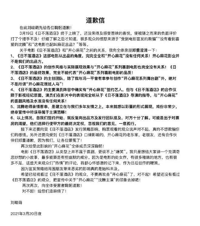 面对舆论的压力,导演最终在个人微博上写了一封道歉信。