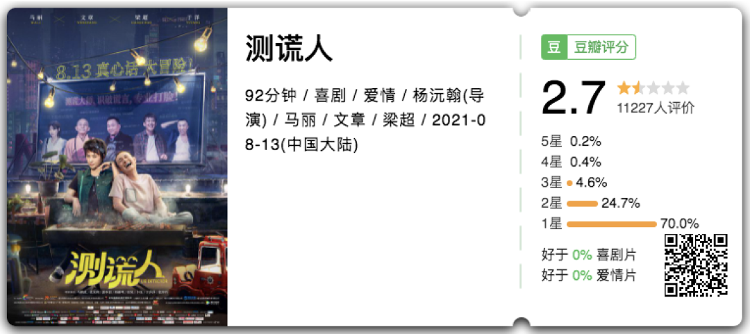 由她和文章主演的《测谎人》竟被网友打出了 2.7 的超低分!