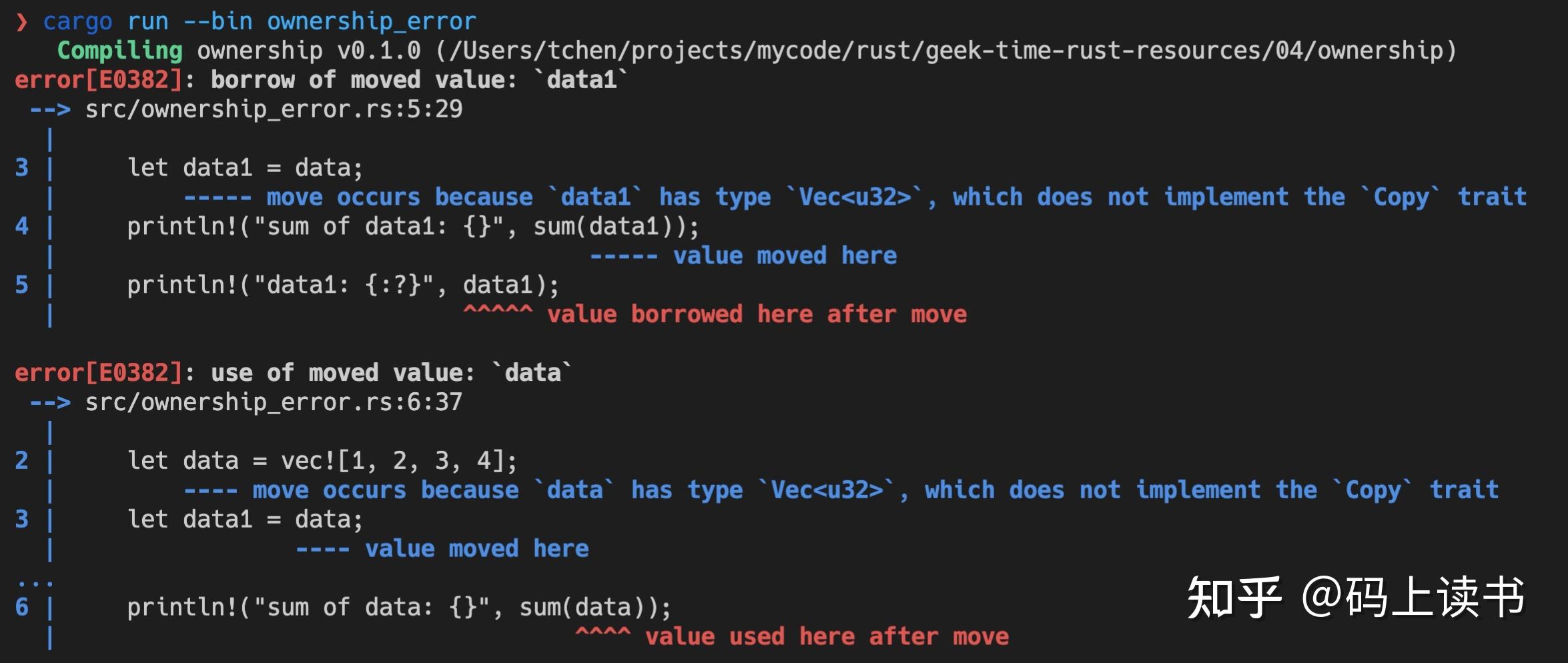 从错误信息可以看出,不能使用已经移动过的变量。 这是因为我们在打印data1的时候,data1实际上已经在上面调用sum(data1)的时候。所有权已经转移(move)到sum()里了。所以后面就不能使用了。 那怎么才能 在sum()后面使用data1呢? 我现在知道的方式有2种: