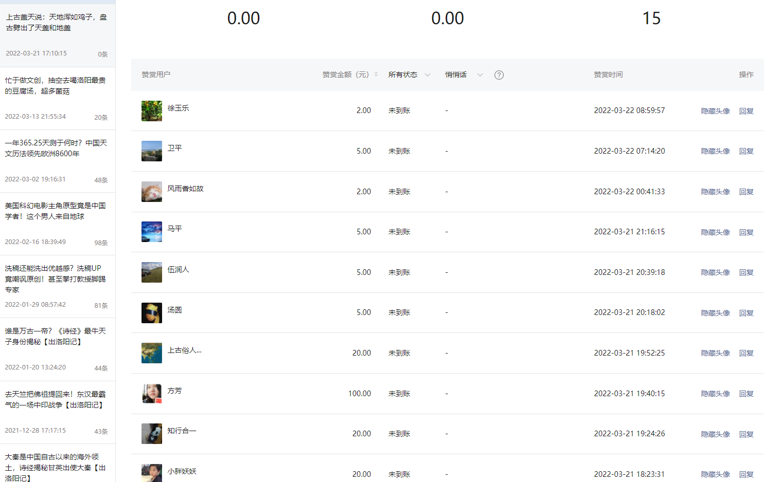 3月21日发布的视频消息,目前有十几个粉丝赞赏过,但后台显示赞赏金额一直是零。这是为何?