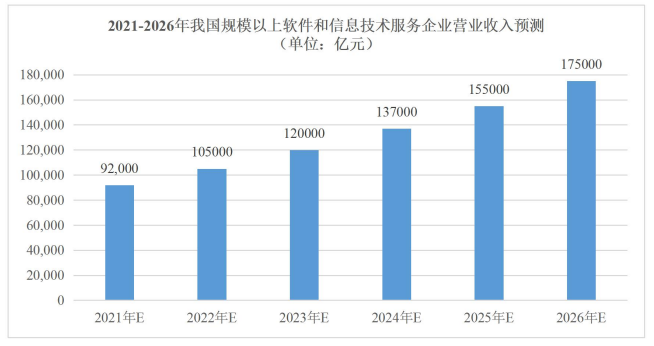 近年来,信息技术的不断发展以及下游应用领域需求的不断增长,一定程度上促进了软件和信息服务行业市场规模的增长。预计 2021-2026 年,行业年均增长率或将稳定在 10%-15%之间,截至 2026 年,行业规模以上企业营业收入有望达到 17.5 万亿元左右。