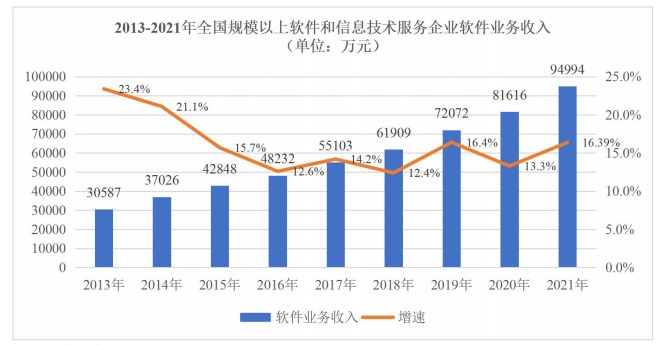根据工信部发布的《2021 年软件和信息技术服务业统计公报》显示:2021 年,全国软件和信息技术服务业规模以上企业超 4 万家,累计完成软件业务收入94,994 亿元,两年复合增长率15.5%。